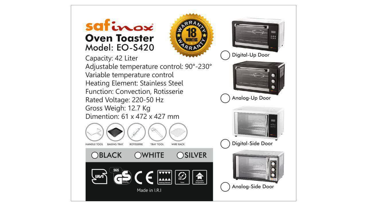 مشکی220ولت و50هرتز.توان1600وات.لامپ داخل فر دارای فن چرخش هوای داخل فر.جوجه گردان ودارای پنل لمسی